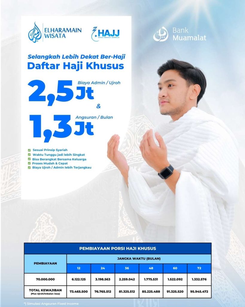 Program Pembiayaan Nomor Porsi Haji bekerja sama dengan Bank Muamalat hadir sebagai solusi syariah bagi Anda yang ingin segera mendaftar haji. Menggunakan prinsip syariah dan telah mendapatkan persetujuan DSN MUI, program ini aman dan terpercaya. Dengan DP hanya Rp2,5 juta dan cicilan mulai satu jutaan per bulan, Anda sudah dapat memperoleh nomor porsi haji resmi. Wujudkan niat suci ke Baitullah lebih cepat, terencana, dan sesuai syariat bersama Elharamain Wisata.